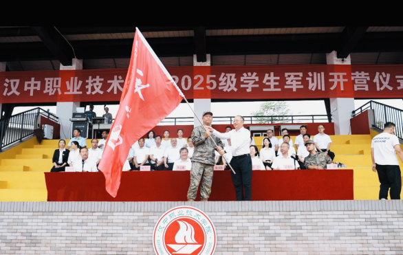 开营仪式在雄壮的国歌声中拉开帷幕,晏继红宣读《汉中职业技术学院2025级学生军事训练实施方案》,张国海为军训团授旗,师范学院数媒2501班周艺同学代表全体参训学员发言。
