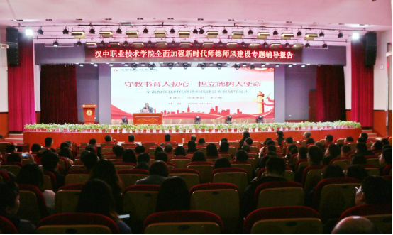 2025年10月24日,汉中职业技术学院党委书记李志刚以“守教书育人初心 担立德树人使命”为题,在行政楼多功能厅为全体教职工作全面加强新时代师德师风建设专题辅导报告。党委副书记袁力主持报告会。