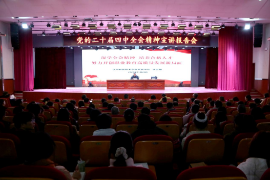 2025年11月28日,汉中职业技术学院党委书记李志刚以《深学全会精神培养合格人才努力开创职业教育高质量发展新局面》为题,在行政楼一楼多功能厅宣讲党的二十届四中全会精神。全体院领导,副科级以上干部,职能部门全体人员,马克思主义学院教师,专职辅导员,第二十九期入党积极分子等600余人参加报告会。党委副书记袁力主持会议。