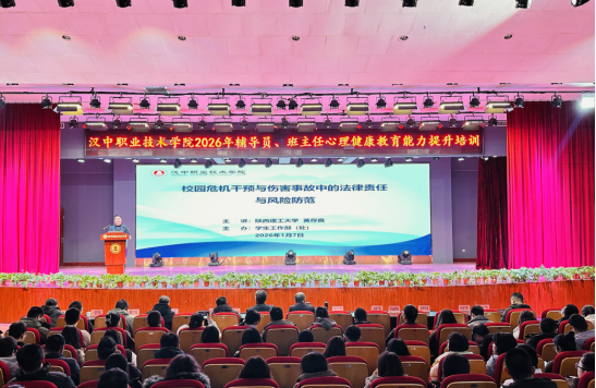1月7日下午,汉中职业技术学院在行政楼一楼多功能厅举办2026年首场辅导员、班主任心理健康教育能力提升专题培训。学院党委副书记、院长张国海,党委委员、副院长张仕锋和各二级学院党总支书记、学管办主任,全体辅导员、班主任、心理辅导站教师、兼职心理咨询师、大学生心理健康教育任课教师,学工部(处)、保卫处全体人员,物业公司负责同志等200余人参加培训。培训由学工部(处)长曾良华主持。
