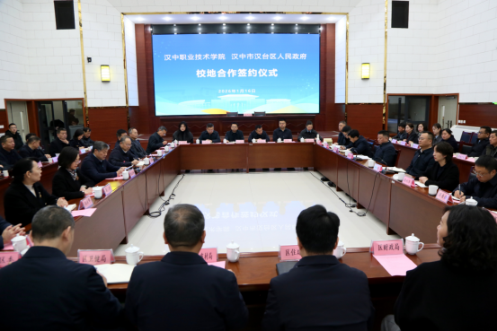 2026年1月16日,汉中职业技术学院与汉中市汉台区人民政府在学院图书馆学术报告厅举行校地合作签约仪式。汉台区委书记龚新伟,区委副书记、区长赵亿谋,区委常委、区政府党组副书记秦超,副区长周利华,区政府党组成员王付杰;汉中职院党委书记李志刚,党委副书记、院长张国海及班子成员出席签约仪式。张国海主持会议并与赵亿谋代表校地双方签约。