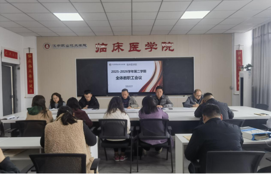 【临床医学院】2月27日,临床医学院召开了新学期工作专题会议,全体教师参加会议,会议由临床医学院院长纪建华主持。临床医学院副院长张雷通报了4项现代职教体系建设改革重点任务完成情况、2026年陕西省职业院校技能大赛备赛情况和口腔专业群建设终验工作完成情况等工作。综合办主任马珊珊就学期初教学准备工作作出具体部署。临床医学院党总支书记周建军传达了《汉中职业技术学院2026年校园安全稳定工作实施方案》文件精神,领学了《教师师德失范行为负面清单及处理办法》,强调了师德失范“一票否决制”的刚性要求,明确全体教职工需严格对照负面清单自查自纠。纪建华要求,全体教职工要迅速收心,调整状态,以饱满的精神面貌投入到教育教学各项工作中;立足全心,聚焦主责主业,全力履职尽责,推动各项工作落地见效;坚守放心,树牢底线思维,时刻绷紧安全稳定这根弦,筑牢校园安全防线;追求舒心,持续优化育人环境,积极营造文明和谐氛围,以扎实成效迎接文明校园验收工作。