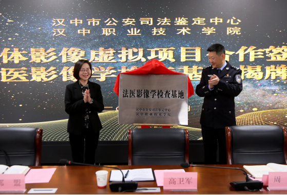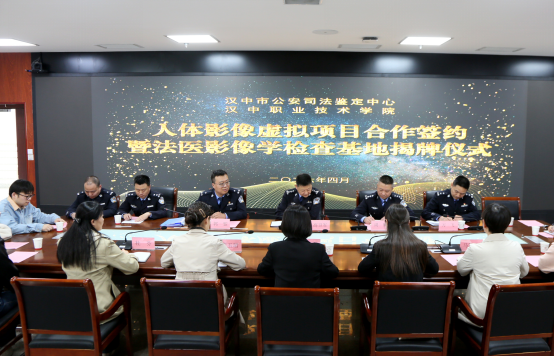 4月21日下午,汉中职业技术学院与汉中市公安司法鉴定中心人体虚拟影像项目合作签约暨法医影像学检查基地揭牌仪式在学院行政楼410会议室举行。学院党委副书记袁力,汉中市公安刑事侦查支队支队长高卫军、刑事技术大队相关负责人,医技学院、教务科研处、医学类实验实训中心负责人,教师代表参加仪式。