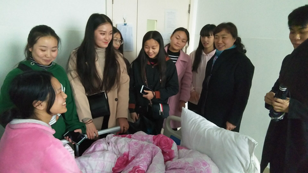 2018年11月初,“我身边的好学生”--护理系2014级五年制护理10班学生赵瑞,在咸阳市延安大学附属医院实习期间不慎摔倒,经检查为股骨骨折,需要手术治疗。考虑到赵瑞同学的特殊情况,护理系第一时间委派班主任刘苗老师赶到咸阳,对赵瑞看望和照顾,并宽慰、鼓励她积极配合治疗。与此同时,护理系领导第一时间将赵瑞意外受伤的情况向学院相关部门及院领导进行了汇报。学院党委副书记,纪委书记杨剑斌明确指示要从生活、思想、学习等多个方面对赵瑞进行帮助,护理系联系院领导余俊光得知此事后非常重视,询问学生伤情、治疗情况及心理状况,学生处还针对该生家庭困难的特殊情况对其启动了应急补助措施。护理系领导多次通过电话、短信等方式联系赵瑞,实时了解她的治疗及恢复情况。在了解到该生情绪十分低落不利于治疗康复后,该系党总支副书记董玉珺立即带队,组织学管办主任徐坤、学管办心理专干任攀宇、班主任刘苗一行再次于11月16日前往咸阳看望赵瑞。学院及系部领导、老师的关爱让赵瑞十分感动,也深受鼓励。她表示在这个充满关爱的大家庭里倍感温暖,自己一定会振作起来、积极配合治疗、争取早日康复,绝不辜负学院领导的关心、老师的培育,努力成为一名合格的白衣天使,将自己所收获的关爱与温暖不断播撒出去!