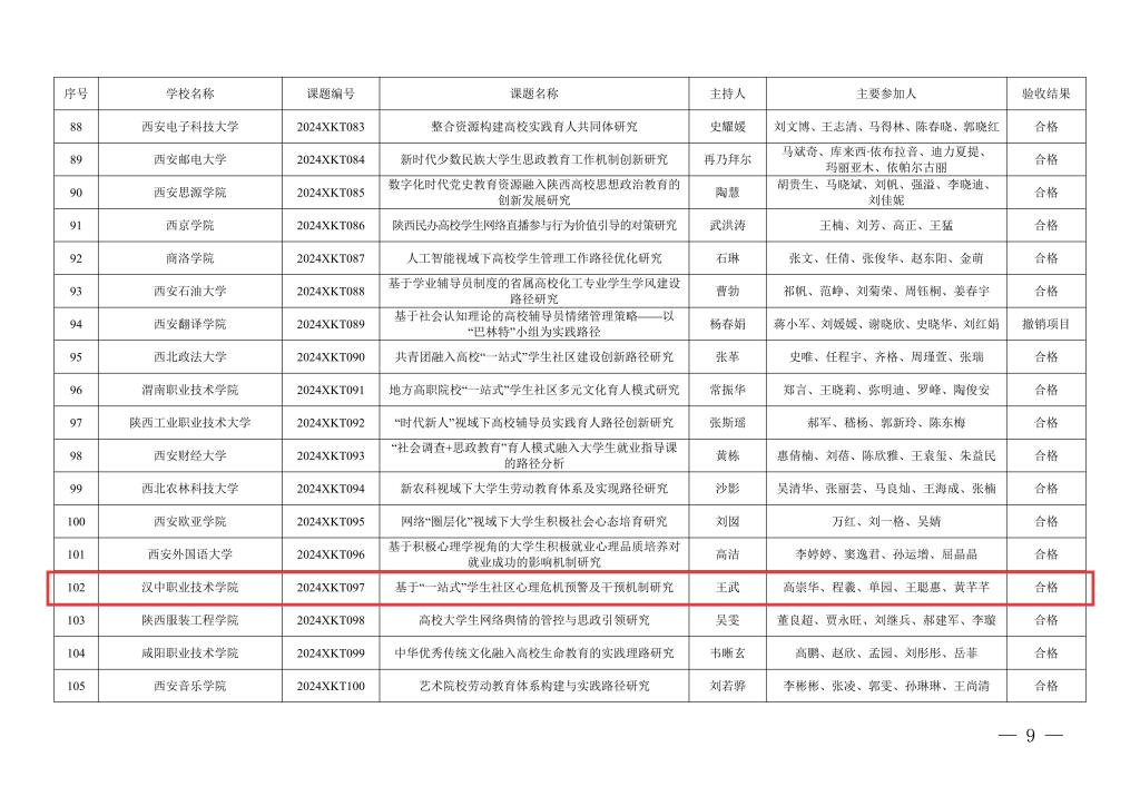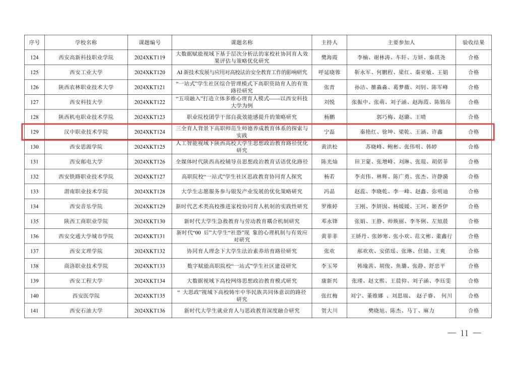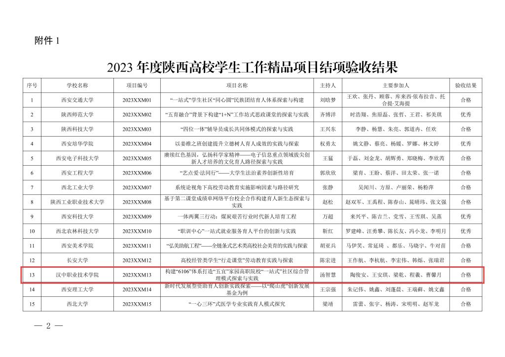学院相关负责同志表示,此次省级精品项目和研究课题的顺利结项(题),是陕西省委教育工委对汉中职院学生工作质量与科研能力的充分肯定,也是学院长期以来高度重视学生工作、不断加强队伍建设、持续深化育人内涵的集中体现。这些成果的取得,不仅凝聚了项目团队的智慧与汗水,也为学院进一步创新学生工作思路、改进工作方法、优化体制机制奠定了坚实基础。下一步,学院将继续坚持“以生为本”的工作理念,加大对学生工作实践与科学研究的支持力度,促进优秀成果的转化与应用,推动“三全育人”工作不断走深走实,助力学院各项事业高质量发展。(学工部 梁乾)编辑/郑韵千