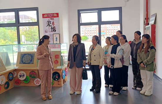 王小琴带领师生一行实地参观了非遗展示厅、生产车间及文创产品展区,详细介绍了羌绣的历史传承、技艺特点与产业发展现状。师生们近距离观察了羌绣艺人飞针走线,从基础针法到复杂纹样设计,深入了解了每件作品背后的文化内涵与匠心精神,直观感受非遗文化与现代产业融合的活力。