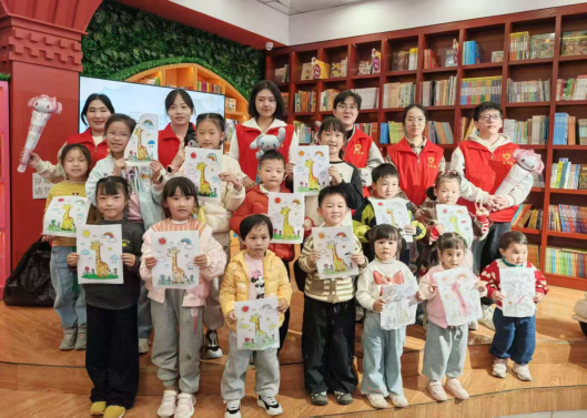 活动当日,志愿者们在带队老师的指导下,有序协助研学活动、仔细整理书架、耐心解答读者咨询。在绘本讲解环节,志愿者用生动活泼的语言为小朋友们讲述《长颈鹿不会跳舞》经典绘本故事,通过角色模仿、情景再现等方式激发孩子们的阅读兴趣。随后的手工折纸和涂色活动中,志愿者们一对一指导,鼓励孩子们发挥想象力,亲手制作五彩斑斓的纸艺作品和图画。现场欢声笑语不断,孩子们在志愿者的陪伴下尽情享受创作与学习的乐趣。