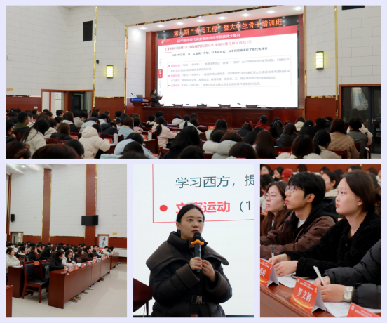 12月10日,学院第九期“青马工程”暨大学生骨干培训班第三课在图书馆二楼报告厅开讲。本次团课以“以中国式现代化全面推进中华民族伟大复兴”为主题,由马克思主义学院综合办公室副主任刘璇老师主讲,160名青马学员集中学习。