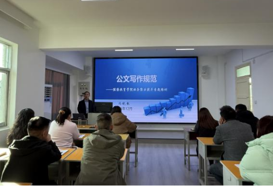 继续教育学院院长冯晓敏结合行政工作经验,以《公文写作规范》为题授课。他从公文格式规范与撰写技巧两大核心维度出发,讲解了公文处理的标准化要求和简讯、请示、报告等常见应用文体和法定公文的写作技巧,通过案例对比、要点提炼的方式,强调了公文写作的严谨性与规范性。同时还分享了西蒙学习法、费曼学习法等高效学习方法,鼓励全体教职工树立“终身学习”理念,以持续学习筑牢业务根基。