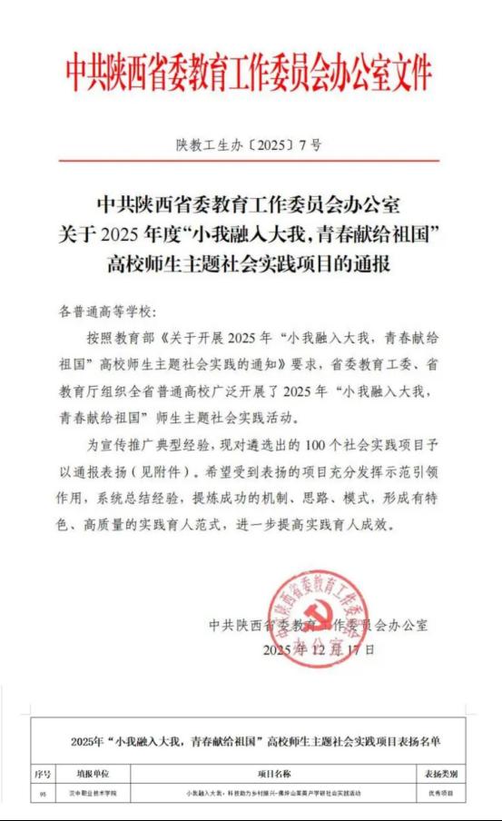 近日,中共陕西省委教育工作委员会发布《关于2025年度“小我融入大我,青春献给祖国”高校师生主题社会实践项目的通报》,由汉中职业技术学院团委牵头组织、医学技术学院申报的“小我融入大我,科技助力乡村振兴-佛坪山茱萸产学研社会实践活动”获评优秀项目。